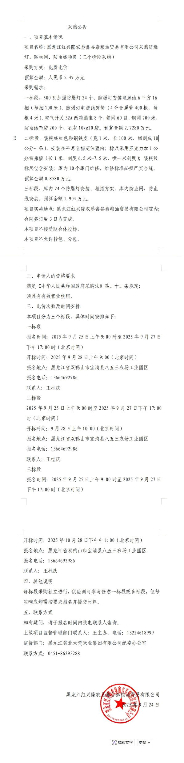 鑫谷泰糧油貿(mào)易有限公司采購防爆燈、防蟲網(wǎng)、防蟲線項(xiàng)目采購公告