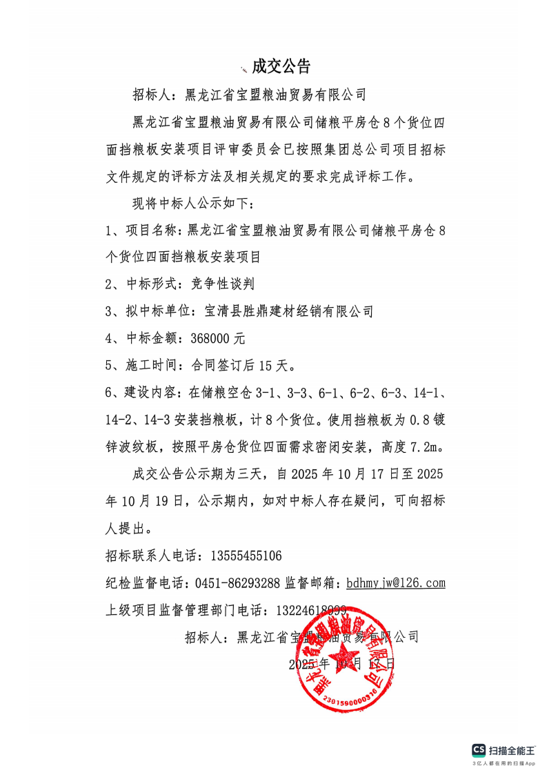 寶盟糧油貿易有限公司儲糧平房倉8個貨位四面擋糧板安裝項目成交公告