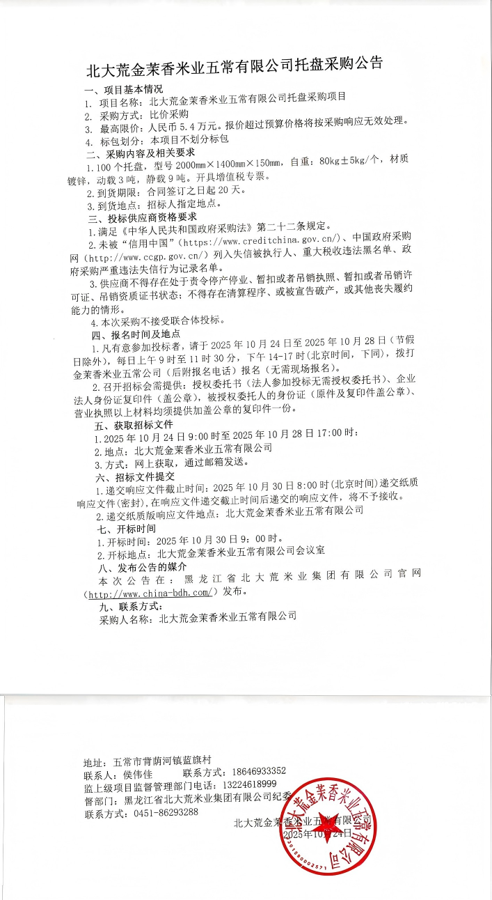 北大荒金茉香米業(yè)五常有限公司托盤采購公告